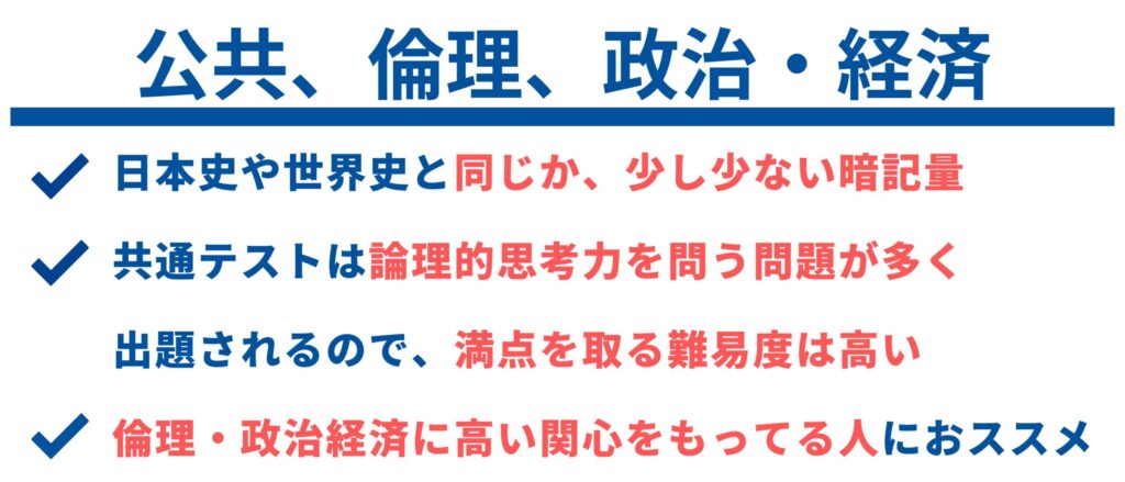 また、倫理や政治経済は中学・高校でも勉強することが少なく、馴染みがあまりない方も多いと思いますので、新たな勉強に意欲的であり、倫理・政治経済に興味をもつことができる方にはオススメです。