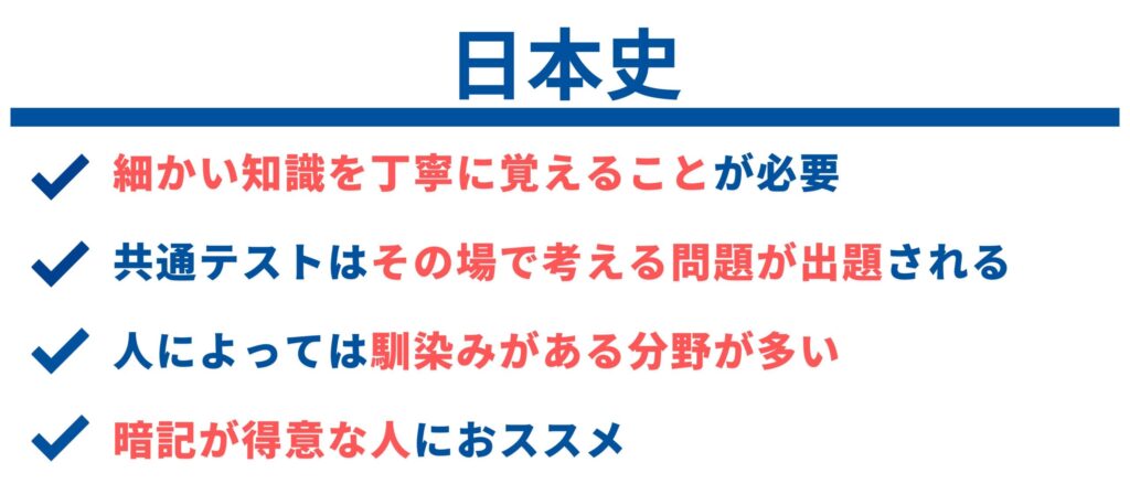 実は日本史は世界史と同じくらい覚えることがあります。日本の歴史を学ぶので暗記量は世界史ほど多くないと想像する方も多いと思いますが、細かい知識をインプットする必要があり、暗記量の面では世界史とあまり大きな差はありません。
