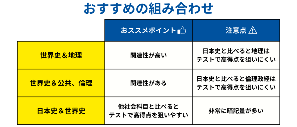 また、以下で紹介する日本史と世界史の組み合わせは高得点を狙うことができる組み合わせではありますが、負担がかなり大きくなるため、世界史と地理でなければ世界史と公共、倫理、といった考えで選ぶ方も多いかもしれません。