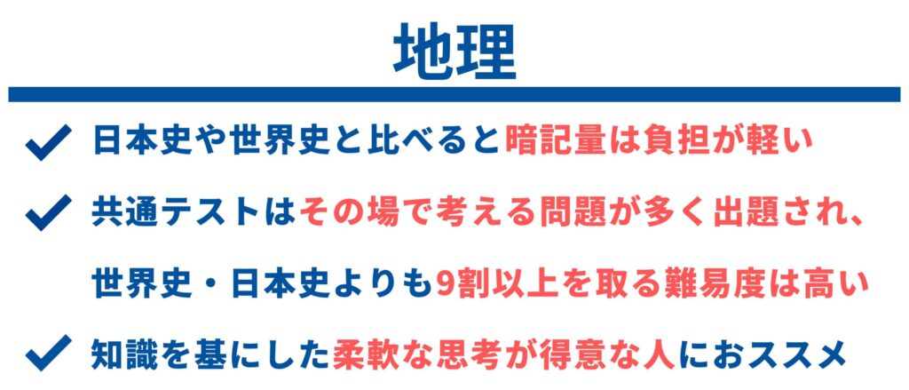 地理は、暗記量の面では日本史や世界史と比べると負担が軽いと言えます。世界史・日本史と比べ、知識の面ではなんとなく知っていることが多く、暗記することが少なく感じるはずです。