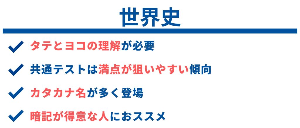 暗記が得意な人にはかなりおススメです。共通テストでは他の社会科目に比べ、その場で論理的に考える必要のある問題が少なく、満点が狙いやすい傾向にあると思います。また、世界史はカタカナ名が多く登場し、日本史は漢字が多く登場しますので、どちらが覚えやすいかという観点で選んでもよいかもしれません。