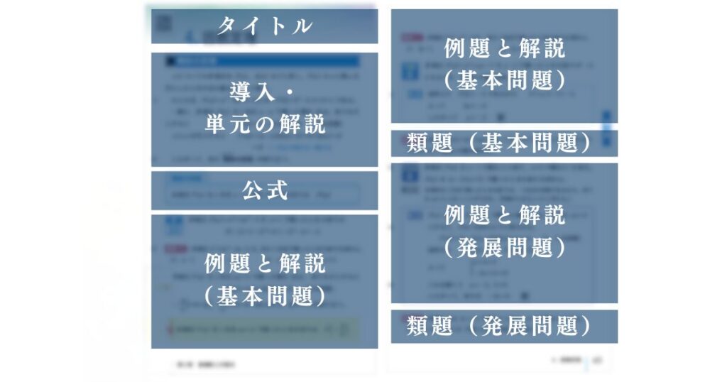 学校や先生によって進め方の違いは多少あるものの、基本的には教科書本体と問題集の2つを使って授業を進めています。教科書本体の構成は大まかには以下のイメージです。