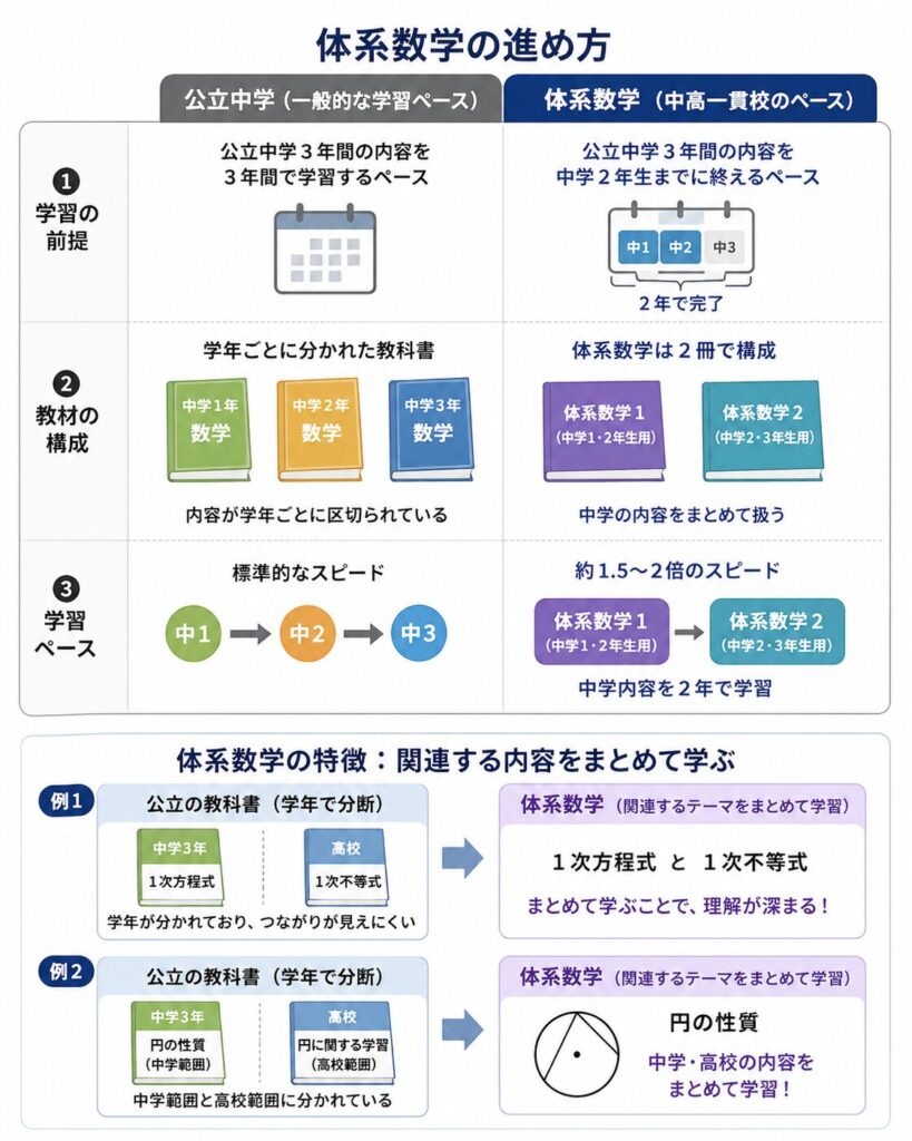 ポイント:公立中学は学年ごとに段階的に進む一方、体系数学は中高6年間を見通して速い進度で進む。授業進度・単元のつながり・復習のしにくさに注意。