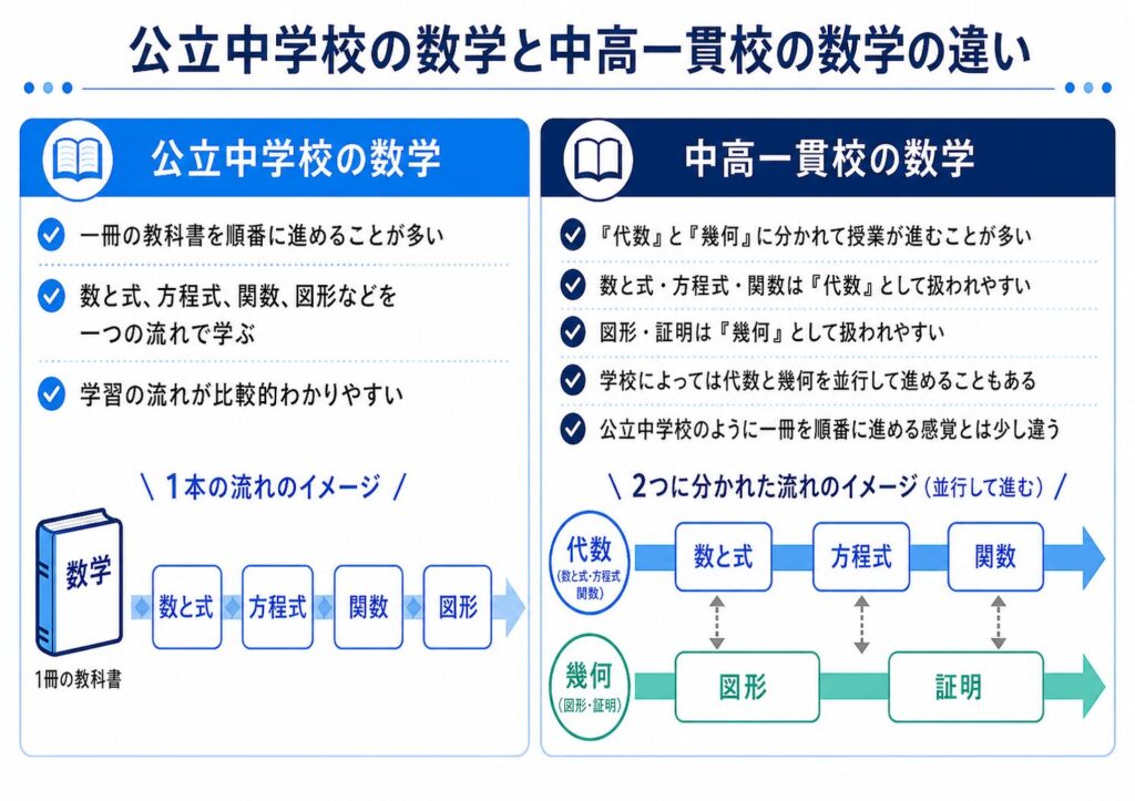 中高一貫校では、「代数」と「幾何」に分かれて授業が進むことが多いです。たとえば、数と式、方程式、関数などは代数分野として、図形や証明などは幾何分野として扱われます。そのため、公立中学校の数学のように一冊の教科書を順番に進める感覚とは少し違います。また、学校によっては代数と幾何を並行して進めることもあります。
