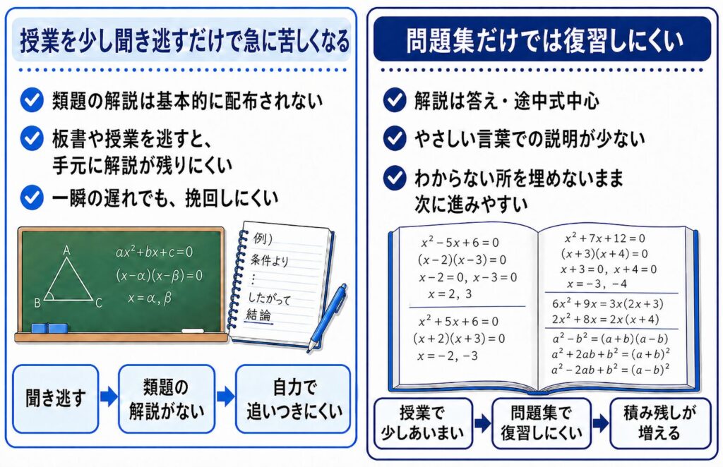 その結果、少しの聞き逃しや理解不足がそのまま放置されやすくなり、次の授業、次の単元でさらに分からなくなるという悪循環に入りやすくなります。保護者の方から見ると「家で復習すればよいのでは」と思いやすい場面でも、実際には復習するための材料そのものが足りないということが、一貫校の数学では起こりえます。